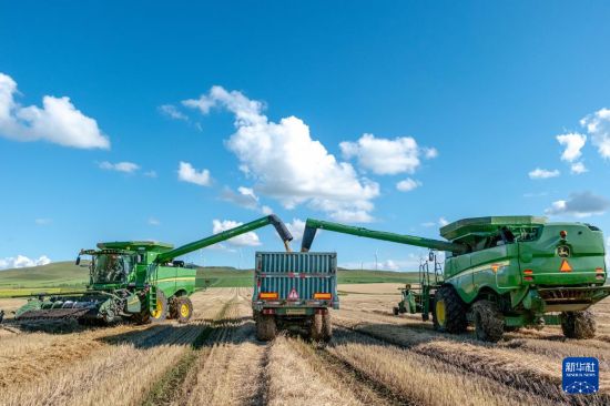 8月20日,呼倫貝爾農(nóng)墾拉布大林農(nóng)場的工人駕駛農(nóng)機將收獲的小麥裝車。