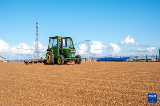 8月20日,呼倫貝爾農(nóng)墾拉布大林農(nóng)場的工人駕駛農(nóng)機翻曬小麥。