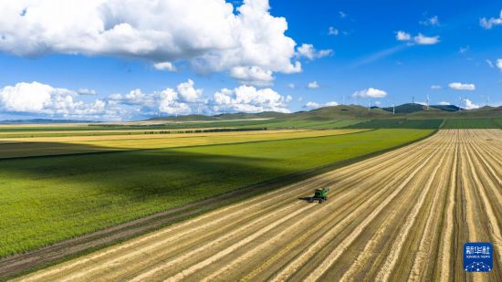8月20日,呼倫貝爾農(nóng)墾拉布大林農(nóng)場的工人駕駛農(nóng)機收獲小麥(無人機照片)。