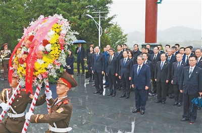 朝鮮內(nèi)閣副總理鄭明秀陪同憑吊。中國代表團(tuán)全體成員及中國駐朝鮮使館館員等約100人參加憑吊活動。