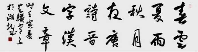 王家驥先生善于用濃筆表現(xiàn)沉雄厚重,在提按頓挫中表現(xiàn)跌宕遒逸,在疾澀互參中表現(xiàn)線條的內(nèi)在節(jié)律??v觀王先生的書法作品,在結(jié)字造型上既富于變化,又能運(yùn)用參差、主次、均衡、對(duì)比、虛實(shí)、節(jié)奏等表現(xiàn)美的法則;在章法上獨(dú)具匠心,無論是字內(nèi)的開合揖讓,還是字間的疏密掩映,都具有很高的造詣。