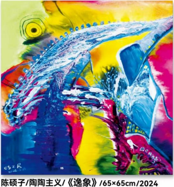 陳碩子的作品風格鮮明,她以陶陶主義“非具象、非理性、非主題”為創(chuàng)作哲學打破傳統(tǒng)繪畫的框架束縛。她摒棄對現(xiàn)實物象的摹寫、邏輯思維的限制及特定主題的約束,以大膽跳躍的色彩、奔放灑脫的筆觸、超現(xiàn)實的構圖,構建出充滿詩意的精神宇宙,將潛意識中的情感與想象化為視覺符號,傳遞對生命本質的哲思。在她的作品《樂知》中,色彩的碰撞與交融仿佛奏響一曲無聲的樂章引領觀者在藝術的世界中聆聽內心的聲音;《織夢》以其絢爛的色彩和奇幻的構圖,為人們編織出一個個瑰麗的夢境,激發(fā)著無限的想象;《獸首巡殤》則通過獨特的藝術語言,表達出對生命與歷史的深刻思考。