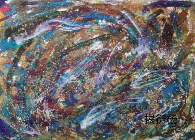 觀賞揭衍楊先生的彩墨畫,猶如進(jìn)入一個(gè)撲朔迷離的神奇世界。那些墨線與色塊的縱橫交織、時(shí)隱時(shí)現(xiàn)的神秘幻象、墨與色的大膽碰撞,編織出或斑斕、或瑰麗的奇幻世界,令人在不自覺中產(chǎn)生遐想。